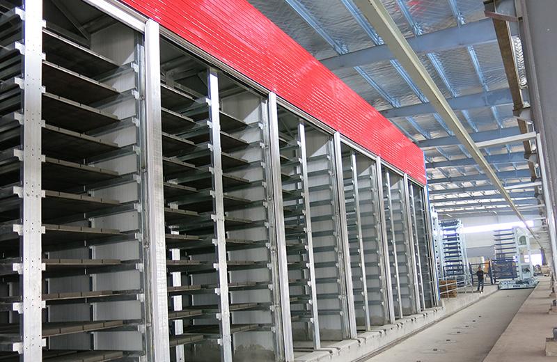 Le processus de fabrication tout entier contrôlé par ordinateur et exploité par automatisation couvre les fonctions suivantes: Le capteur mesurant la teneur en humidité des matériaux bruts, ratio d’humidité par ajustement dynamique intelligent et mélange, contrôle de la production, moulage et transport des matériaux humides, convoyage des briques humides, levage par élévateur et empilement, chariot transbordeur automatique pour le transport vers le four de durcissement, reconnaissance automatique du chariot transbordeur sur un four vide, nombre de four, alimentation des produits humides dans le four de durcissement, transport de produits secs durcis vers l’abaisseur, abaissement de produits secs vers le convoyeur en couche de produits secs, transfert vers la zone de palettisation, empilement par préhension et palettisation automatique de produits secs dans des palettes. L’unité de l’empilement est le mètre cube selon les exigences déterminées. Le transport des produits vers la zone d’emballage automatique se fait par camion à plate-forme.
